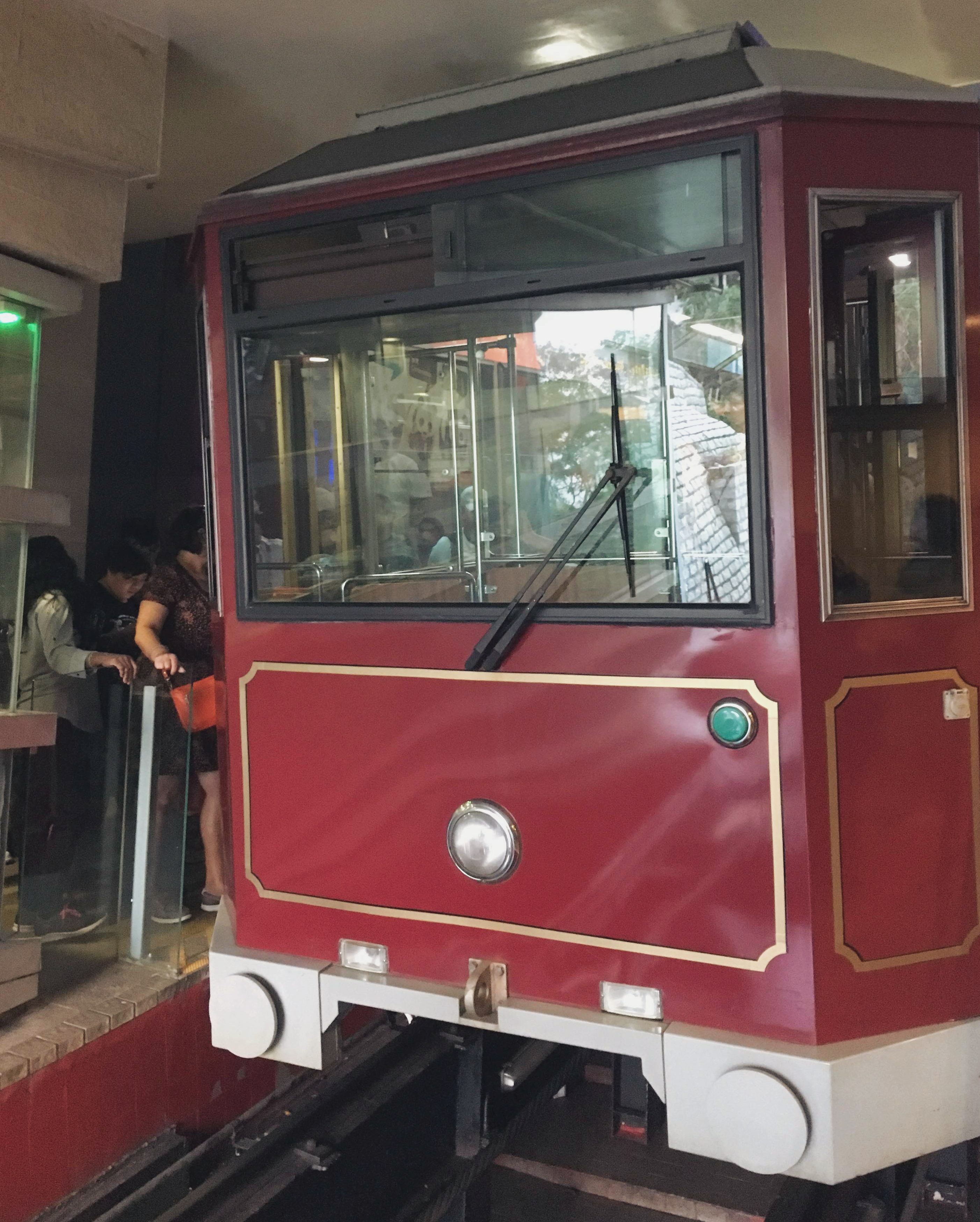 Tarkoitus on ehtiä bucket listallamme olevaan Victoria Peakin näköalapaikkaan vielä ennen auringonlaskua, jotta saisimme kuvia niin päivänvalossa kuin pimeälläkin. Metro vie meidät Admiraltyn metroasemalle, josta kävelemme Garden Roadia pitkin Peak Tram -pääteasemalle. Victoria Peakille pääsisi myös jalan ja reitti on kuulemma huikean hieno, mutta tällä kertaa aikataulu ei anna periksi. Olemme lukeneet etukäteen, että ylös-alas kulkevaan vanhanaikaiseen raitiovaunuun voi joutua jonottamaan, silti jonon pituus yllättää. Noin kolmen vartin jonottamisen ja meno-paluu -lippujen ostamisen jälkeen olemme vaunussa, joka aloittaa vajaan kymmenminuuttisen nousunsa paikoin melko jyrkkääkin rinnettä pitkin. Sillä tavalla jyrkkää, ettei tee mieli nousta vaunussa seisomaan edes valokuvaamista varten.