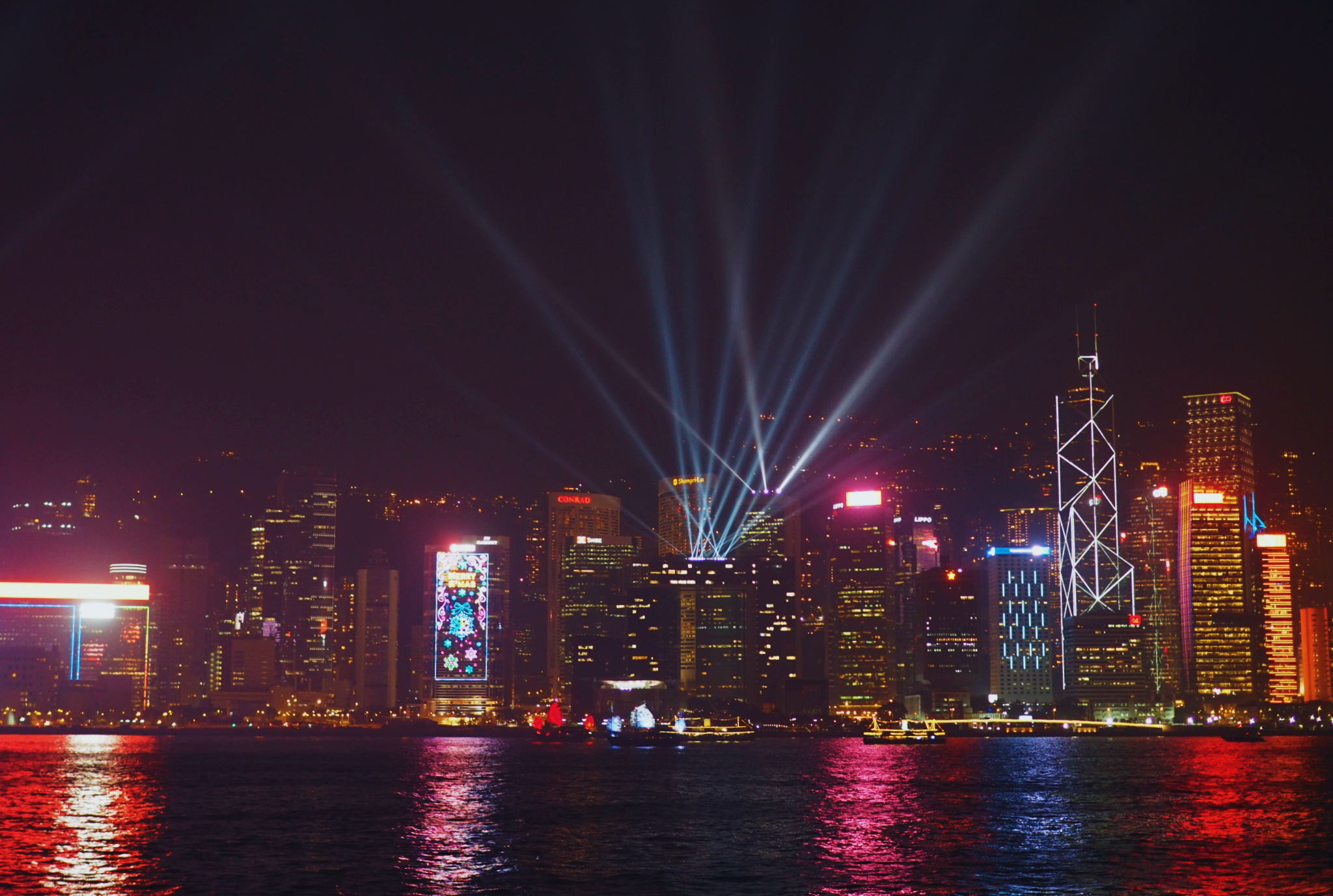 Koska kyseessä on viimeinen iltamme Hong Kongissa, olemme vakaasti päättäneet nähdä jo kerran missatun Symphony of Lights -shown Kowloonin rannalta käsin. Tällä kertaa ehdimme ajoissa paikalle ja löydämme Star Ferry -lauttaterminaalin vierestä jo täynnä ihmisiä olevan näköalatasanteen. Hong Kongin saaren pilvenpiirtäjät näyttävät valoineen upeilta ilman erityistä valoshowtakin. Kun musiikin säestyksellä muutamasta pilvenpiirtäjästä ammuttujen vihreiden lasersäteiden ja muiden valoefektien avulla toteutettu Symphony of Lights lopulta käynnistyy, osoittautuu se lieväksi pettymykseksi, jota yritämme lieventää käymällä jälkeenpäin katsomassa arvokkaan Heritage 1881 -rakennuksen upeita joulukoristeita. Palaamme Hong Kongin saarelle lautalla. Saaren puolella Wan Chain laiturilta on tolkuttoman pitkä matka metroasemalle, mutta reilut 30 senttiä maksava lyhyt lauttamatka on kokemisen arvoinen.