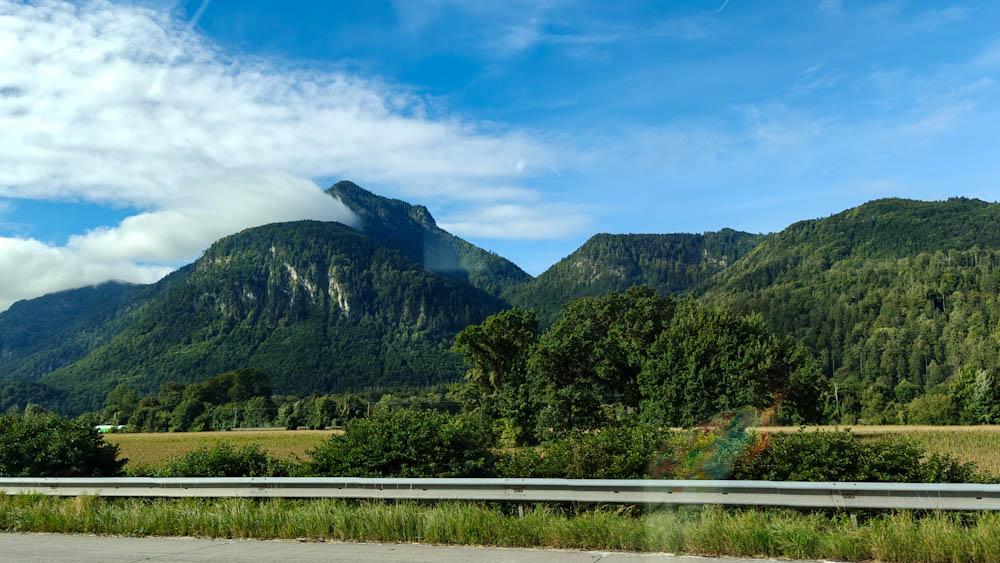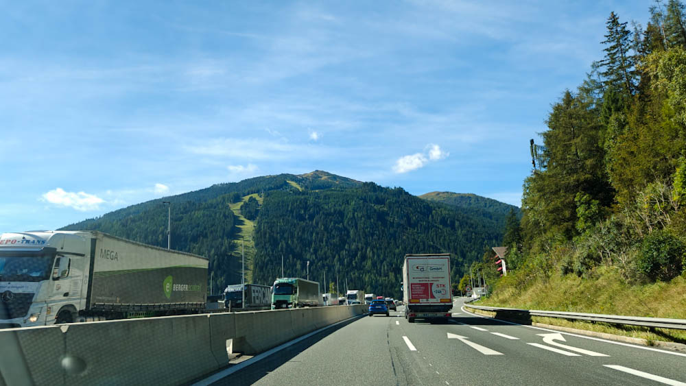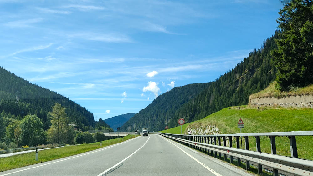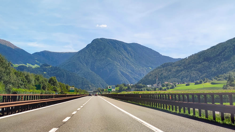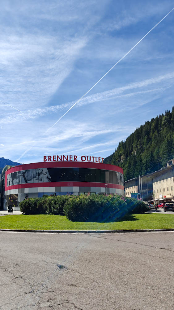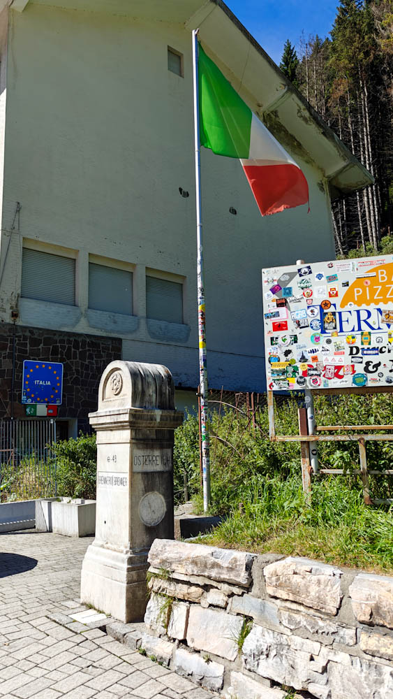 Aamiaisen jälkeen pakkaamme auton ja suuntaamme kohti Alppeja ja Itävallan rajaa. Rajan ylitys on koruton, autobaanalta toiselle. Itävallan puolella pitää maksaa 12 euron tietullimaksu ja sen päälle vielä körötellä jonossa loputtomilta tuntuvien tietöiden takia. Onneksi nekin jäävät pian taakse ja Alppien halki kulkeva moottoritie alkaa vetää. Auton ikkunoiden takana maisemat muuttuvat huikeiksi, välillä tuntuu että vuoret kaatuvat päälle. Poikkeamme Brennerin solassa lataamassa autoa ja shoppailemassa outlet-ostarilla. Vasta siellä tajuamme, että haa, mehän kävelimme juuri Itävallasta Italiaan! Raja on siis keskellä outlettia. Löydämme sen ulkopuolelta myös ”virallisen” rajapyykin, jonka edessä voi seistä toinen jalka Itävallan puolella ja toinen Italian puolella. Ostamme matkaeväät Brennerin solan Italian puolella sijaitsevasta Eurospin-marketista, sitten auto kohti etelää!