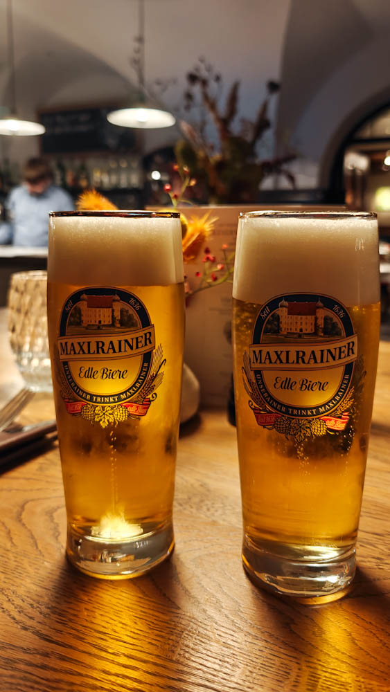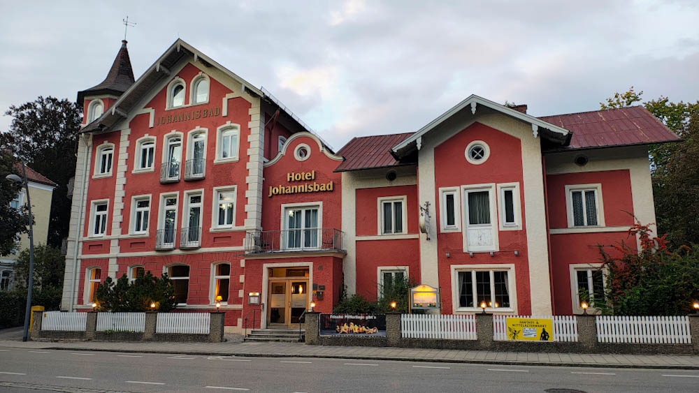 Päivän viimeinen pysähdyspaikkamme on Münchenin kaakkoispuolella, melko lähellä Itävallan rajaa sijaitseva Bad Aibling. Kaupunkia lähestyessä horisontissa siintävät upeat vuorenhuiput; olemme melkein Alpeilla. On jo hämärää kun pysäköimme automme hotellin edustalla olevalle parkkipaikalle. Johannisbad -hotelli on viehättävä, ajan patinoima vanha rakennus, jonka aulassa on tietenkin valtava takka, takan yläpuolella täytetty hirvieläimen pää ja takan edessä ryhmä saksalaisia nauttimassa punaviinipullollista. Idyllistä. Hotellin ravintola on valitettavasti kiinni juuri tänä iltana, niin myös googlesta etukäteen illallispaikaksi valikoitunut kreikkalainen ravintola. Onneksi löydämme keskustasta avoinna olevan hotelliravintolan. Ruokajuomaksi nautitut oluttuopit maistuvat pitkän ajopäivän jälkeen erityisen hyvältä.