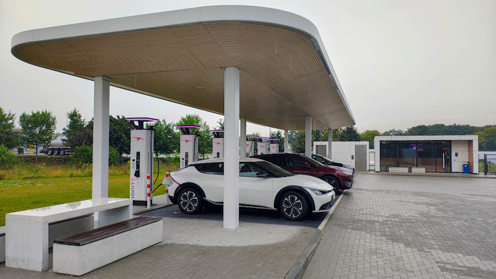 Auton lataamisen kanssa ei Saksassa ole ongelmia, sillä käyttämiämme Ionity-latausasemia on tarpeeksi tiheässä. Yksi näistä on kyllä mainittava erikseen: katetun aseman kupeessa on myös taukohuone kahvi- ja välipala-automaatteineen ja vessoineen! Toisella Saksan latauskerralla huoltoasemakompleksin latauskentällä muistamme ostaa myös Itävaltaan vaadittavan digitaalisen vinjetin (vuorokauden vinjetti maksaa vajaan kympin).