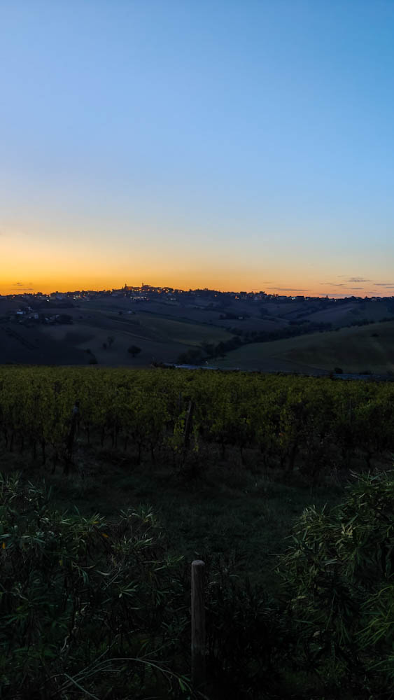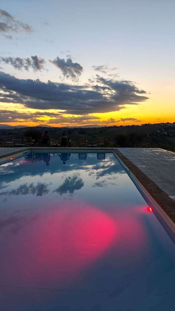 Kun Alpit jäävät taakse ja maisema tasoittuu, on aika pysähtyä espressolle ja antaa aivoille hetki aikaa tajuta, että olemme jälleen rakastamassamme maassa. Kahvitauon jälkeen ajamme -Bolognan esikaupunkialueella tapahtuvaa lataustaukoa lukuun ottamatta- pysähtymättä ensimmäiseen Italian majapaikkaamme. Aurinko on jo laskemassa mailleen, kun saavumme Marchen maakunnan keskivaiheille, muutaman kymmenen kilometrin päässä rannikosta sijaitsevaan San Marcellon kylään ja sen liepeillä olevaan Tenuta San Marcelloon. Se on upea viiniköynnösten, peltojen ja kukkuloiden ympäröimä viinitila. Ilmoittaudumme Federicalle, joka osoittaa meille huoneemme – jossa viihdymme vain tasan sen verran, että saamme tavarat autosta sisään ja vaihdettua uima-asut päälle. Meille on jo muodostunut perinteeksi se, että käymme huuhtomassa matkapölyt uima-altaassa niin pian kuin mahdollista. Altaasta on satumaiset auringonlaskunäkymät Apenniinien vuoristoon ja lähiseudun kukkulakaupunkeihin.