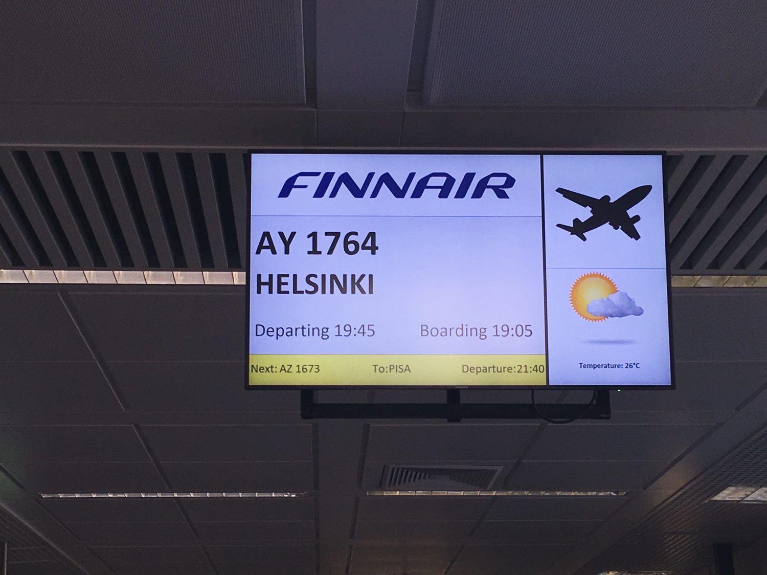 Fiumicinon kentällä lähtöselvitys ei ala ajallaan ja tökkii muutenkin pahasti, mutta onneksi matkalaukkuihin pakatut viinipullot ja muut tuliaiset eivät sittenkään vie laukkujen painoa sallitun rajan yli, joten päästämme helpotuksen huokauksen. Grazie mille Umbria!